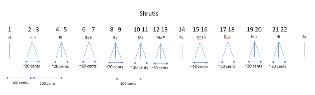 But this cannot be equated with the old shruti system. However, the following system is widely recognised (see picture): The tonic (Sa) and the dominant note (Pa) are seen as having only a single tone each. The other ten notes have a frequency range (as we said before) of around 20 cents. The lower end and the upper end of this range can be seen as separate notes and hence we can get 10*2 = 20 + 2 = 22 notes or shrutis. It should be noted that different musicians use different points within the range of these notes depending on the raga and the mood].