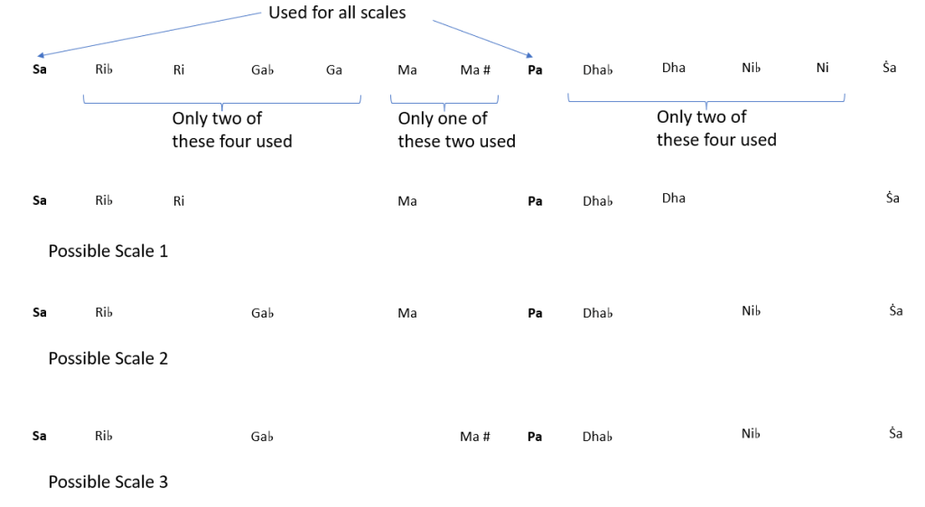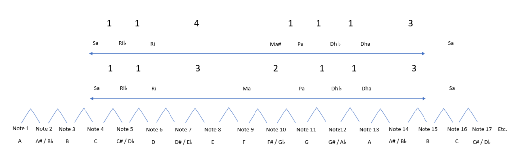Look at the figure. If we choose the scale Sa, Ri♭, Ri, Ma, Pa, Dha, Dha♭, Sa, we get intervals 1,1,3,2,1,1,3. And, if we choose the Ma# variant of this scale we get an even a two-tone interval: 1,1,4,1,1,1,3.